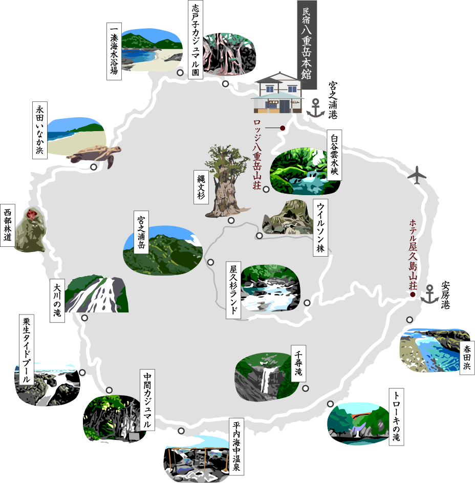 民宿八重岳本館は、利便性のよい宮之浦に位置し、縄文杉登山、宮之浦岳登山、白谷雲水峡散策、ヤクスギランド、紀元杉、島内観光など、